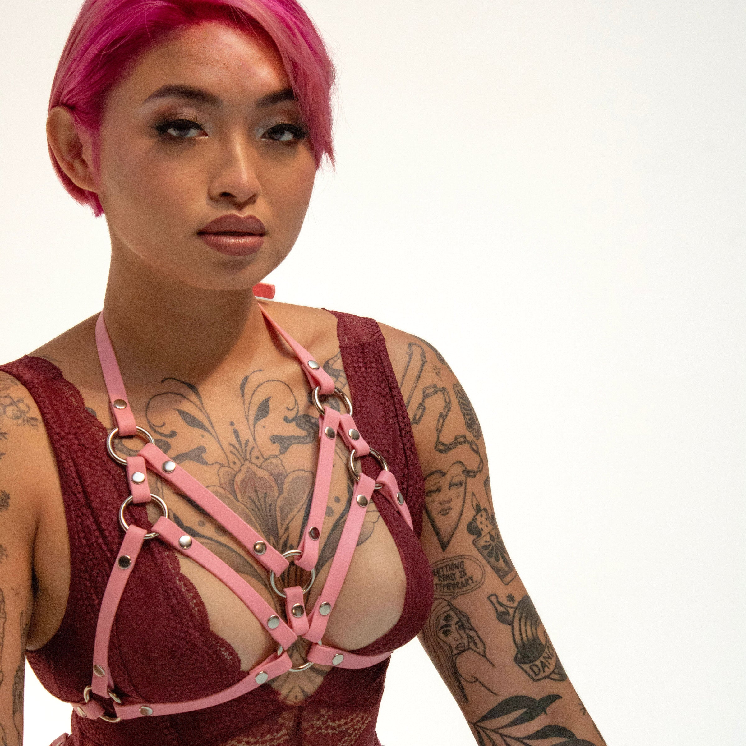 This bra harness is designed to be extremely adjustable and to draw attention to your finest assets and is meant to fit all different chest sizes. Larger ribcage or chest? Go up a size. Smaller to average sized chest? Get your normal size.